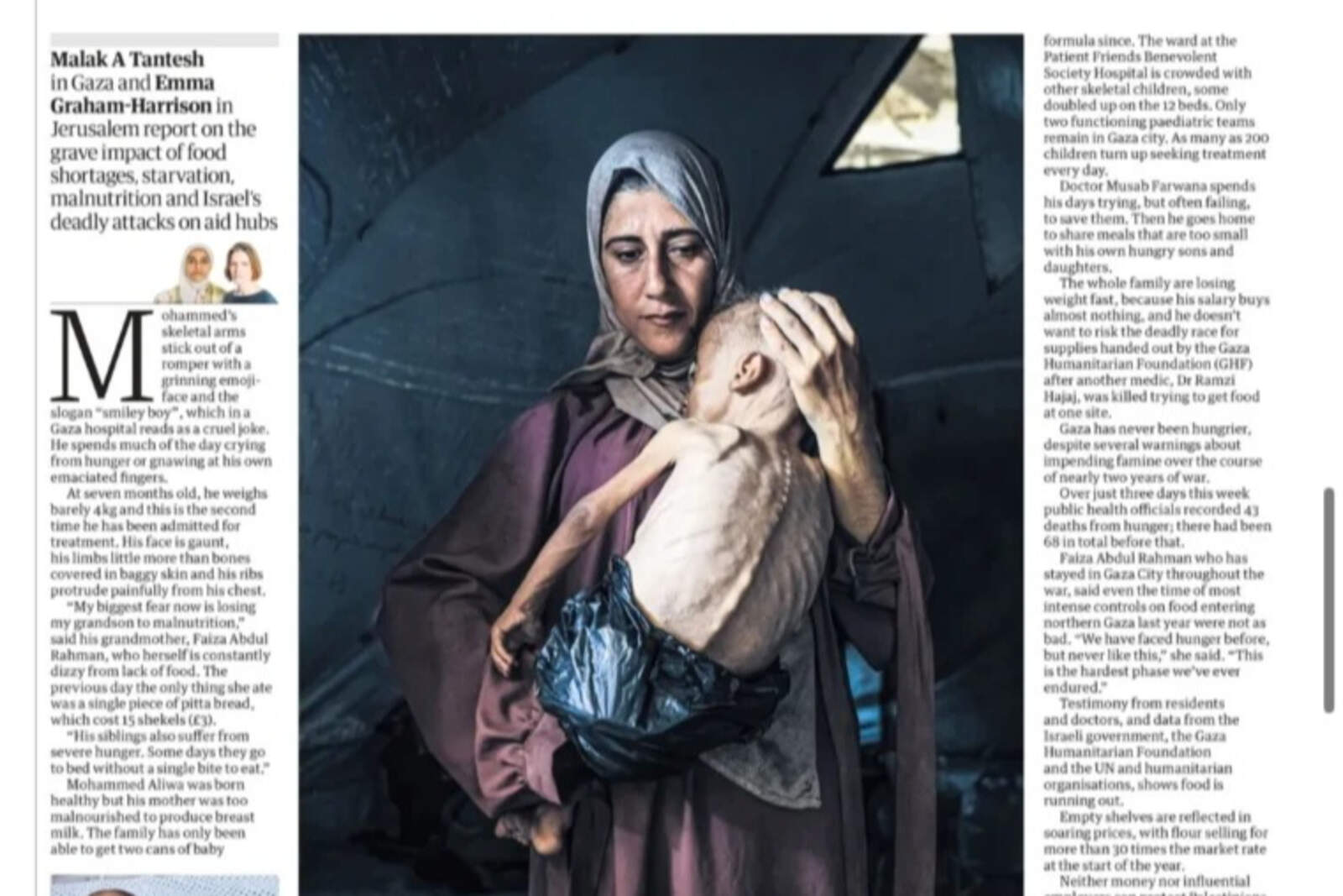 La imagen fue publicada inicialmente por el fotógrafo gazatí Ahmed Jihad Ibrahim Al-Arini y retomada por la agencia turca Anadolu, antes de volverse viral tras aparecer en la portada del Daily Express el 23 de julio de 2025.